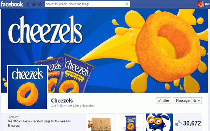 這是馬來西亞和新加坡的官方Cheezels Facebook頁面。專頁以藍色和黄色為主, 黄色則感到强烈的芝士感, 效果更為特出。