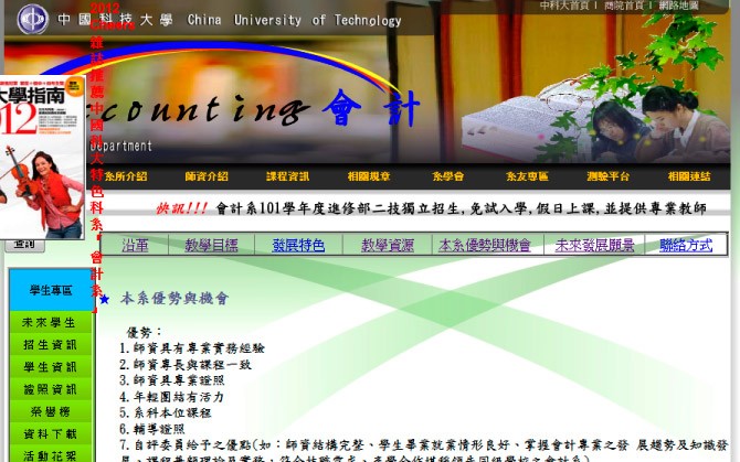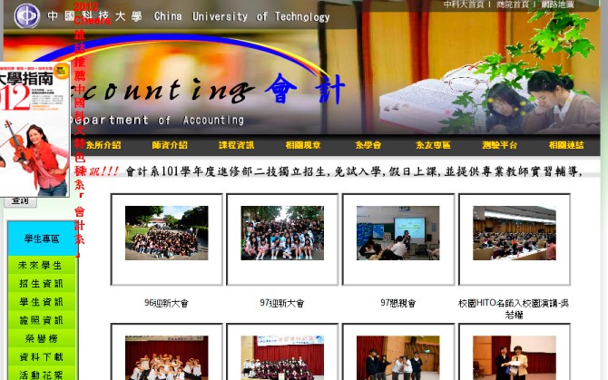 中國科技大學會計系設校於台北,為學生及公眾人仕提供不同的資訊。網站設有供學系學生獨立的會員系統及後台管理發佈即時資訊,亦配有Flash橫額及獨特的圖像設計及效果。